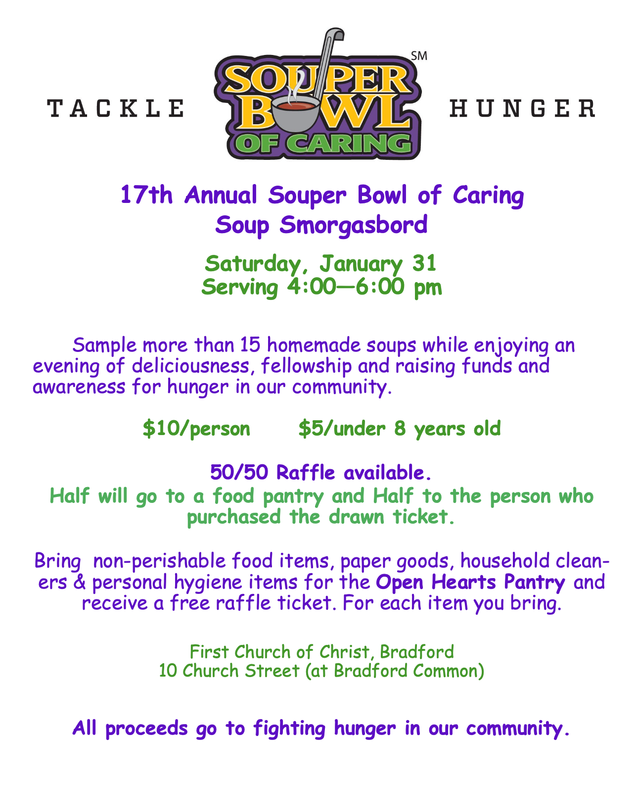 Come out and support our Christian Outreach Team as we unite to bolster area FOOD Banks, as you sample a variety of delicious mid-winter soups! MAKE a friend, BE a friend.